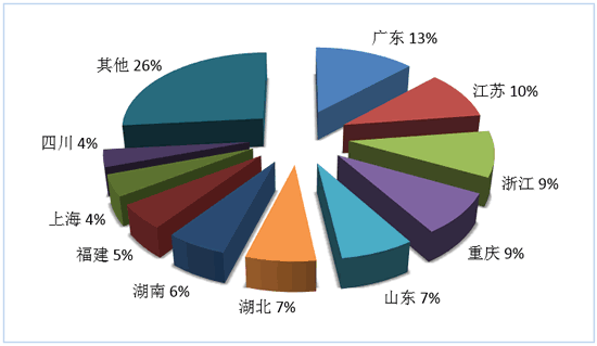 第三季度旅行社國(guó)內(nèi)旅游組織人次排名前十位的地區(qū)由高到低依次為廣東、江蘇、浙江、重慶、山東、湖北、湖南、福建、上海、四川(見(jiàn)圖3)。