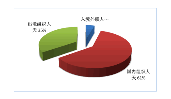 按照入境外聯(lián)人天、國(guó)內(nèi)組織人天、出境組織人天三項(xiàng)指標(biāo),入境旅游、國(guó)內(nèi)旅游、出境旅游市場(chǎng)人天所占份額依次為4%、61%、35%(見(jiàn)圖7)。